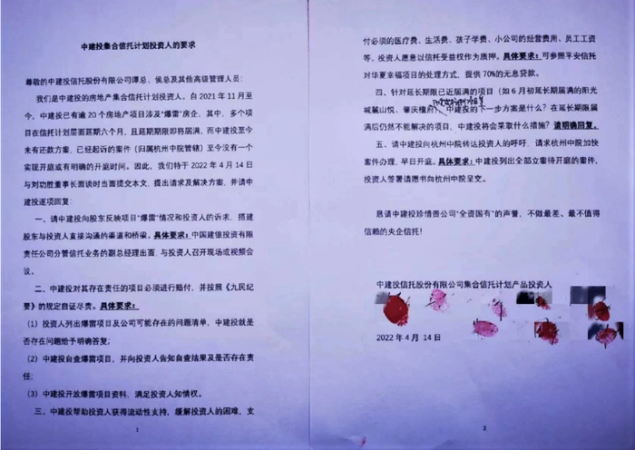会面当日,投资人向党委书记、董事长刘功胜提交了《中建投集合信托计划投资人的要求》(见下附),等待中建投于2022年4月20日之前的回复和反馈。