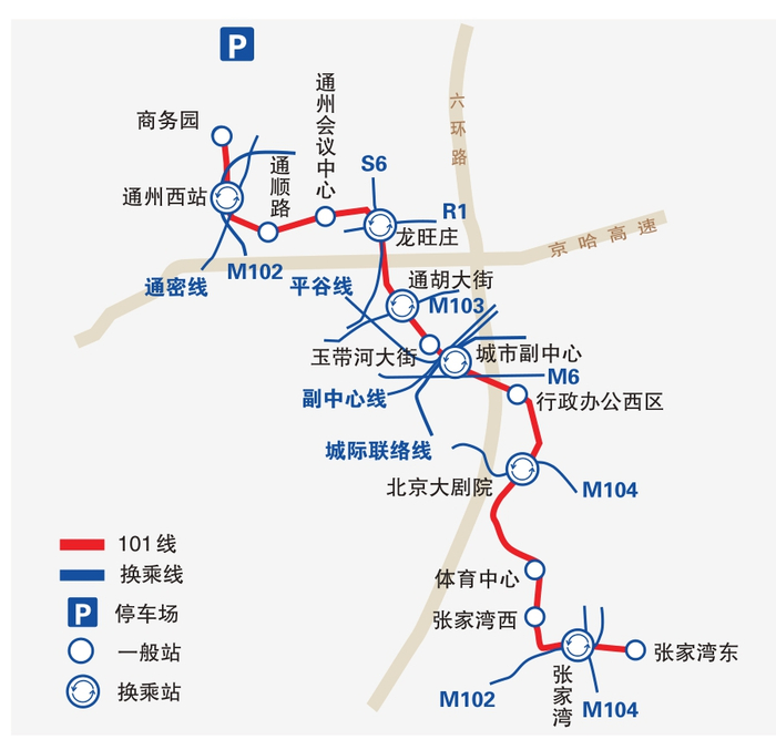 14座车站中,设换乘站6座,可与5条城市轨道交通线路换乘,分别为M6、M102、M103、M104、R1;与5条区域快线/市郊铁路换乘,分别为通密线(S5)、副中心线(S1)、平谷线(S3)、新城联络线(S6战略预留廊道)、新城联络线(S6)。
