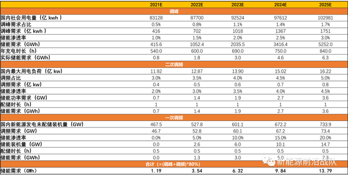 测算依据:基于负荷侧社会用电量。由于国内发电侧新能源电站22年普遍具有强制配储政策,对发电侧新增装机量带来的调峰需求不做测算。