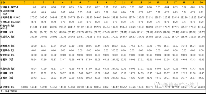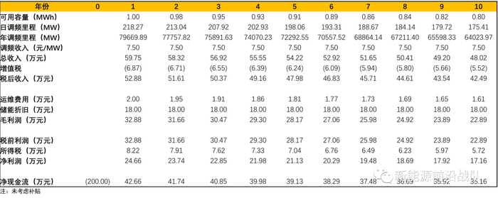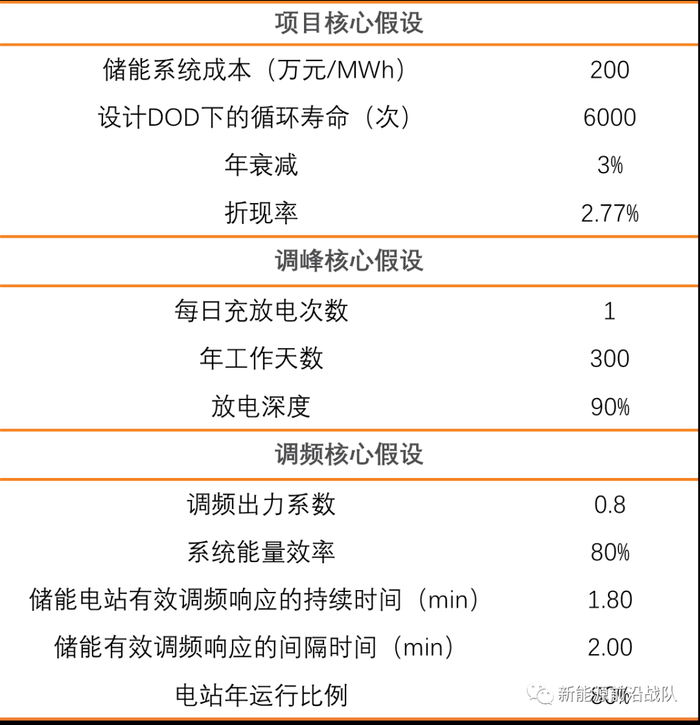 储能项目:建设成本、循环寿命与前文假设相同;由于同时参与调峰+调频需要更高频的充放电,因此年衰减将达到3%,对应全生命周期缩小为8年;