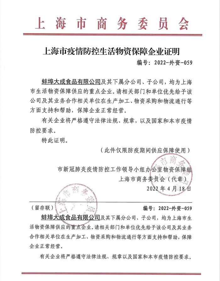 日前,上海市疫情防控工作领导小组办公室物资保障组向保障上海疫情防控生活物资供应的重点企业颁发了“上海市疫情防控生活物资保障企业证明”,蚌埠大成食品有限公司获得此证明。据悉,获得此证明的企业属于上海市保供“白名单”企业,在疫情防控期间运送保供物资时,相关单位会按规定给予运输车辆、人员提供“绿色通道”等支持和帮助。