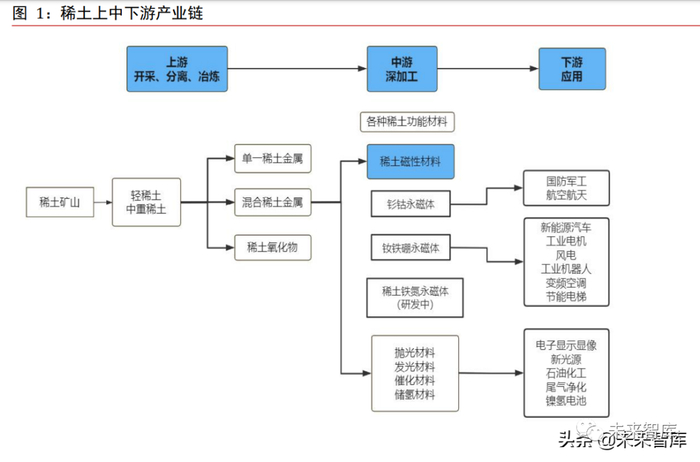 稀土磁性材料位于稀土产业链的中游,上游稀土开采冶炼厂商将所开采的稀土矿进行冶炼分离后得到各类稀土金属以及氧化物的精矿,再将稀土精矿出售给中游磁性材料厂商进行深加工后得到稀土磁性材料以及各种抛光材料、发光材料、催化材料等等,最后根据不同稀土功能材料特性运用于下游不同领域。