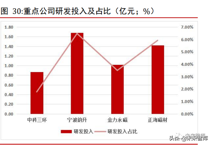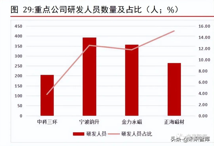 整体来看,根据各公司 2020 年报,中科三环研发人员及占比均为最低,宁波韵升研发人员最多,达到 393,金力永磁研发人员为 357,正海磁材研发人员占比最高,达到15.11%。专利数量方面,中科三环目前拥有专利数量最多,为123 件,金力永磁最少。研发投入方面,2021 年前三季度宁波韵升研发投入最多,达到1.68 亿元,所占营业收入比例最高,中科三环研发投入及占比最小。(报告来源:未来智库)