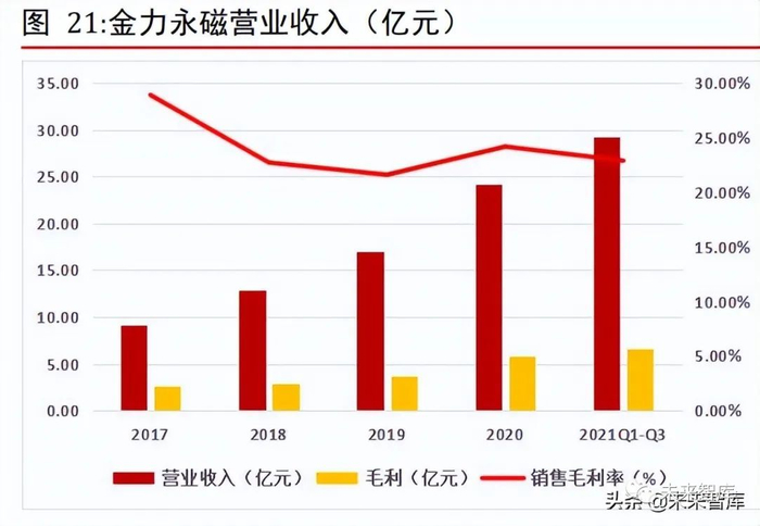 根据弗若斯特沙利文的数据,公司 2020 年使用晶界渗透技术生产4,111 吨高性能稀土永磁材料产品,于晶界渗透稀土永磁市场中排名世界第一,约占21.3%的市场份额。2021年上半年,公司使用晶界渗透技术生产 2,777 吨高性能稀土永磁材料产品,占同期公司产品总产量的 49.70% 根据公司业绩预告显示,2021 年预计营业收入达到 38.71 亿元-43.55 亿元,同比增长60%-80%;预计归母净利润为 4.03 亿元-4.89 亿元,同比增长65%-100%。