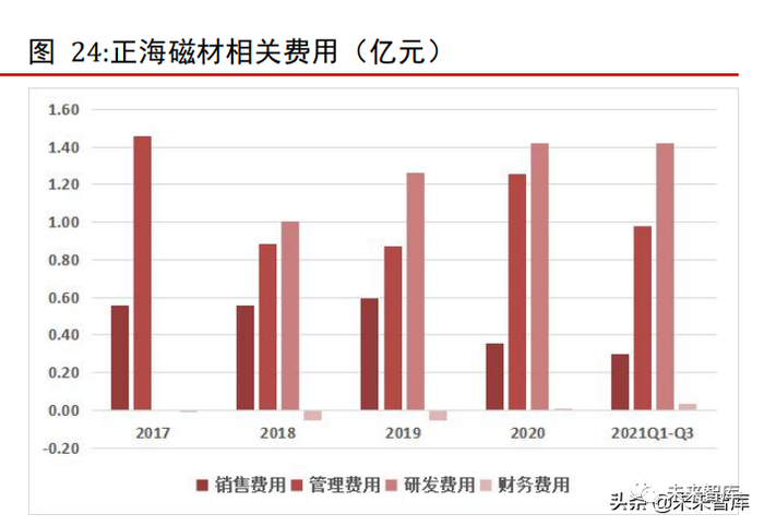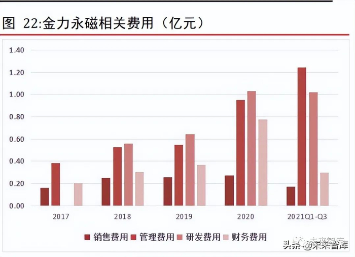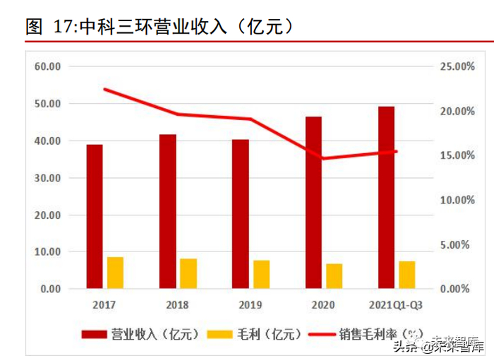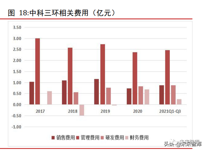 2017~2020 年,中科三环近年来营业收入呈现波动上升趋势,但毛利及毛利率有所下滑。2021 年前三季度毛利为 7.56 亿元,毛利率为 15.39%,较往年有所反弹。公司近年来加大研发费用投入,2021 年前三季度研发费用达到 0.87 亿元,较2020 年同期增加51.1%。2021 年前三季度销售费用为 0.87 亿元,同比增加 49.44%,管理费用为2.46 亿元,同比增加 47.03%,主要系销售增加对应销售及管理相关费用及增加所致。