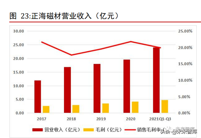 2017 年正海磁材由于客户东方电气破产清算,计提损失增加,2018 年由于公司收购的上海大郡股权商誉减值,使得 2017 及 2018 年净利润大幅减少。2019~2021年公司紧抓市场机遇,加大市场开拓力度,进一步扩大在新能源汽车、家用电器、智能消费电子等下游应用领域的市场份额,同时公司承担了多个新品开发项目,使得公司营业收入及净利润稳步提升。