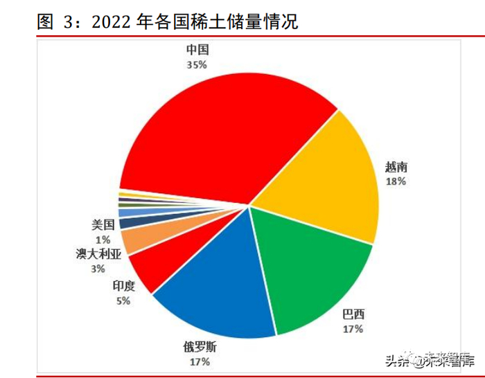 稀土作为一种不可再生资源,且为我国战略性核心资源,在于稀土能大幅度地提高其他产品的质量和性能。根据美国地质调查局的数据显示,2022 年全球稀土储量约为1.25亿吨,其中中国储量为 4400 万吨,约占全球 35%。此外越南、俄罗斯、巴西稀土储量靠前,分别为 2200 万吨、2100 万吨及 2100 万吨,以上四国占据全球稀土储量87%。产量方面,2021 年中国稀土矿产量达到 168000 吨,位居世界第一。其他稀土矿产量较多的国家为美国、缅甸、澳大利亚,产量分别达到 43000 吨、26000 吨及22000吨。