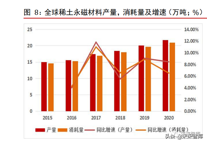 2022 年2 月份,宁波韵升公告募投 10.8 亿元用于包头韵升年产 1.5 万吨高性能稀土磁材项目。2020 年中国高性能钕铁硼磁性材料共计产能接近 9 万吨,而全年产量仅有4.62万吨。根据各稀土永磁上市公司统计,到 2025 年中国高性能钕铁硼磁材产能合计约为20万吨,未来产能利用率有望进一步提升,不断加大高性能磁材供给。(报告来源:未来智库)