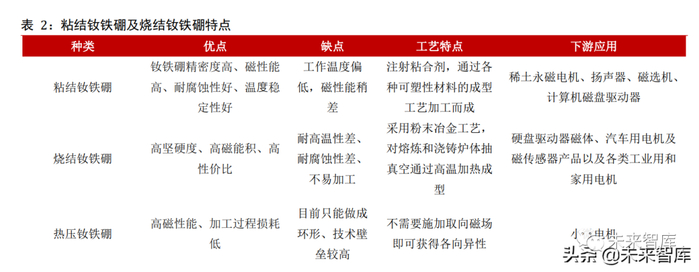 粘结钕铁硼、烧结钕铁硼、热压钕铁硼。当代钕铁硼磁材主要分为粘结钕铁硼及烧结钕铁硼两种,两者区别主要在于工艺上的不同。粘结钕铁硼是在钕铁硼磁粉中注射粘合剂,再通过各种可塑性材料的成型工艺加工而成,目前主要运用于硬盘驱动器磁体、汽车电机及磁传感器以及其他各类工业用和家用电机。
