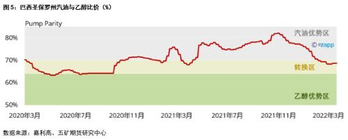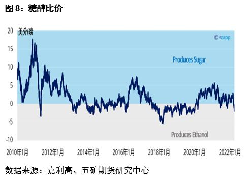 因特殊国际形势,原油价格居高不下,巴西国内乙醇价格跟随上行。截止4月15日,巴西无水乙醇达0.87美元/升,年内涨幅高达30%。后续若原油维持高位,则巴西国内乙醇价格仍有上行可能。随着乙醇价格不断上涨,目前巴西国内乙醇折糖价已高于原糖约2美分/磅,若按往年巴西生产规律来看,此价差水平将显著刺激巴西国内生产向乙醇倾斜,糖醇比有较强下调预期。
