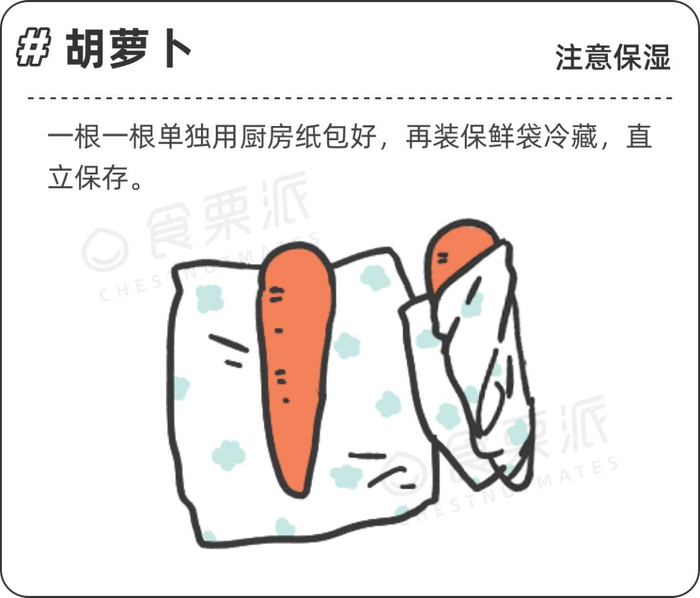 胡萝卜用厨房纸包住即可;芦笋更娇嫩一些,可以用打湿的纸巾包住根部,根部有断面,水分容易流失。
