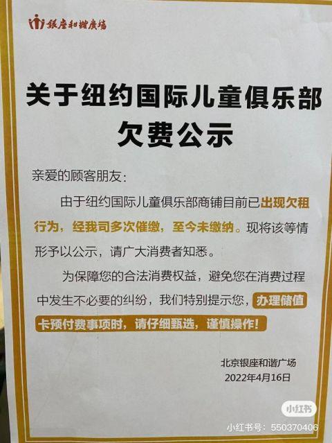 陈女士看到,商场同时挂出一封“欠费公示”称,纽约国际儿童俱乐部目前已出现欠租行为,经过多次催缴,至今未缴纳。并提示消费者“办理储值卡预付费事项时,请仔细甄别,仔细操作。”
