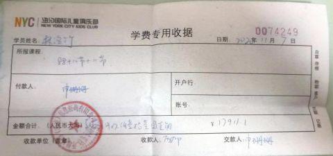 去年9月,陈女士为自己1岁的宝宝报名了位于六里桥店银座和谐广场内的纽约国际早教中心。当时,销售介绍说,这是一家知名的、连锁的早教机构,不管是师资还是生源都很稳定,口碑也很好。陈女士当时一次性缴纳了15900元,其中课程费用总额为15540元,会员注册费金额为360元。