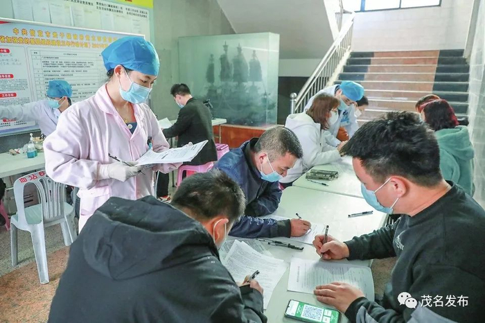 8点50分,经过大约2个小时的车程,采血车准时到达信宜朱砂镇政府临时采血点。10多分钟后,采血现场迎来了第一位献血者。测量体温、检查粤康码和行程卡、填表、体检登记、验血、采血、给献血者派发献血证……随着献血者陆陆续续的到来,现场十几名工作人员开始忙碌起来。