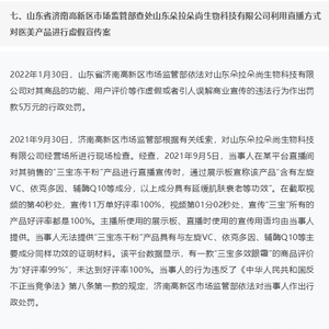 中国网财经4月19日讯(记者 刘天)因为老板在直播间打广告时做了虚假宣传,山东朵拉朵尚生物科技有限公司(以下简称“朵拉朵尚”)被市场监管部门罚款5万元,并成为市场监管总局召开“2022民生领域案件查办‘铁拳’行动”专题新闻发布会的典型案例之一。