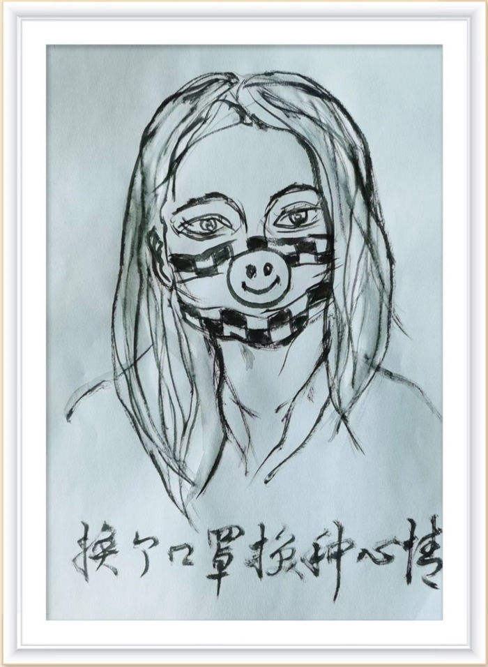 新冠肺病疫情突如其来,回想2020年春,印象最深的是一罩难求。意大利有将家中口罩留给自己老伴,老男人改制胸罩为口罩的,网上一片点赞。我一只口罩整整用了一个多月,直到一边带子绷断为止。口罩,一时间是护身符,是出入证,是正常着装规矩。坊间谈笑,将随时随处可买到口罩,视为抗疫成功的标志之一。庆幸的是,口罩随便购买,这一点很快做到,尽管疫情在全球并没有平复。好在海外戴口罩的人也渐渐多了起来,至少不再将口罩人士视为新冠感染者。巴黎时装秀,很快出现男女模特戴各色特制口罩,风行猫步屹立T台。美化口罩,搭配衣装,绝非海外时装设计界的专利。没发现吗?爱美人士早就萦心于口罩之色系、样式、图案等等,以出新斗奇,同每日更新的服装相搭配,徜徉上海街头,别有风致。更有谐谑人士,将口罩绘上叨雪茄、张大嘴、歪鼻子等奇形怪状。有敢卖的就有敢买的,视频玩家抢录上传,倾倒网友。这幅胡涂漫画,即受此社会现象启发,口罩图案为本人自创,笑脸好似猪鼻。相信佩戴此类口罩出门的人与看到戴此类口罩者的人,眼睛都是含笑的。