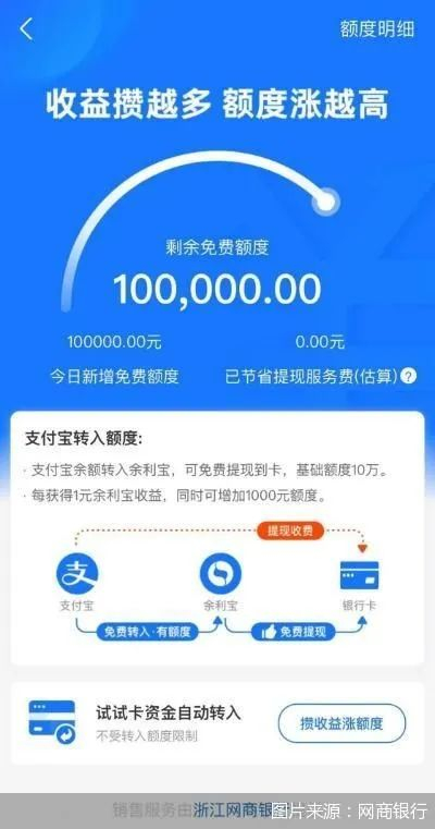 此外,4月19日北京商报记者亲测发现,登录支付宝在网商银行页面开通余利宝后,将支付宝余额转入余利宝,也可免费提现到卡,基础额度10万元,同时,每获得1元余利宝收益,同时可增加1000元额度。