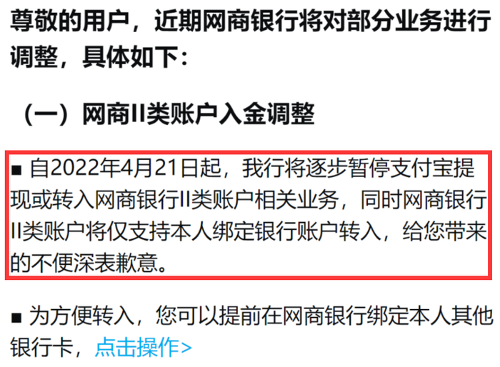 根据网商银行公告,自2022年4月21日起,网商银行将逐步暂停支付宝提现或转入网商银行Ⅱ类账户相关业务,同时网商银行Ⅱ类账户将仅支持本人绑定银行账户转入。