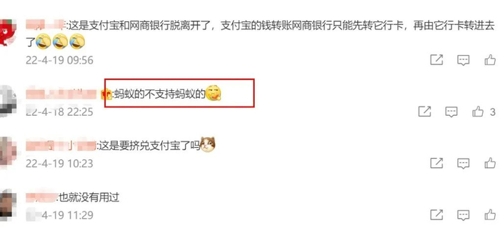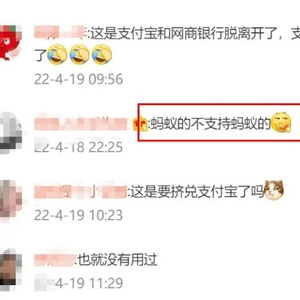 消息一出,迅速引起网友的关注。不少网友认为,这是支付宝和网商银行脱离开了。也有的表示,这是蚂蚁的不支持蚂蚁的……