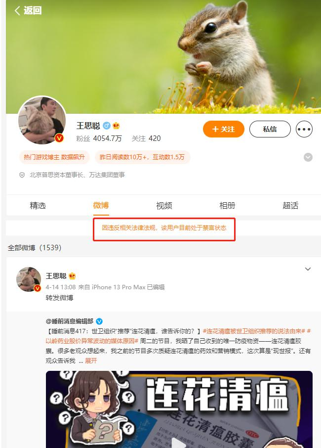 原标题 什么情况?4000万大V王思聪被禁言!曾建议证监会严查以岭药业,并质疑连花清瘟