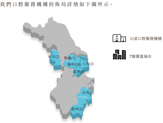 牙博士于2012年在苏州开设首间口腔服务机构。截至2022年3月19日,公司已在华东地区拥有多达31家口腔服务机构,覆盖苏州、南京、上海及温州等华东地区主要城市,于该等口腔服务机构中,有八家诊所运营达五年以上,其于公司的内部分类为成熟诊所。
