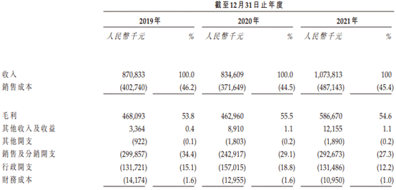 2019年、2020年以及2021年,牙博士的销售成本分别为4.03亿元、3.72亿元、4.87亿元,占公司收入的比例分别为46.2%、44.5%、45.4%。