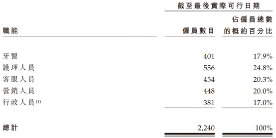 截至2022年3月19日,牙博士营销人员为448人,占雇员总数的概约百分比为20.0%。