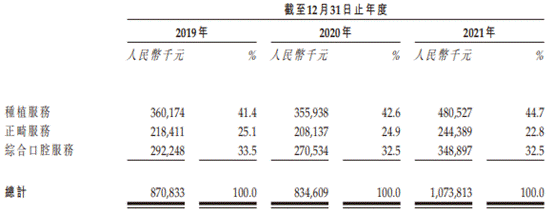 2019年、2020年及2021年,牙博士种植服务产生的收入占比分别为41.4%、42.6%、44.7%;正畸服务产生的收入占比分别为25.1%、24.9%、22.8%;综合口腔服务收入占比分别为33.5%、32.5%、32.5%。