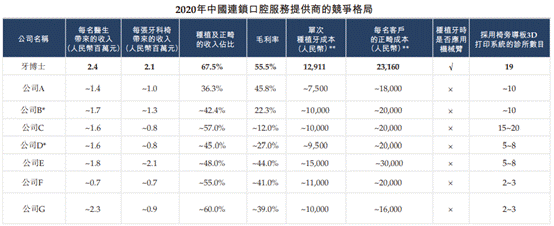 此外,据牙博士招股书,2020年,公司单次种植牙成本为12911元,每名客户的正畸成本为23160元,均远超同行。