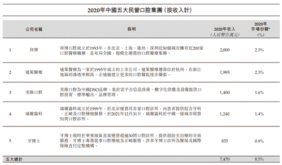 据牙博士招股书,根据灼识咨询报告,截至2020年,以收入及市场份额计,牙博士于民营口腔服务提供商中排名第五,牙博士占中国民营口腔服务市场的约0.9%份额。