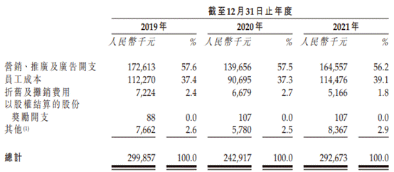 营销、推广及广告开支占公司销售及分销开支的很大一部分,过去三年分别约占57.6%、57.5%及56.2%,金额分别为1.73亿元、1.40亿元、1.65亿元,占公司总收入的比例分别为19.8%、16.7%、15.3%。