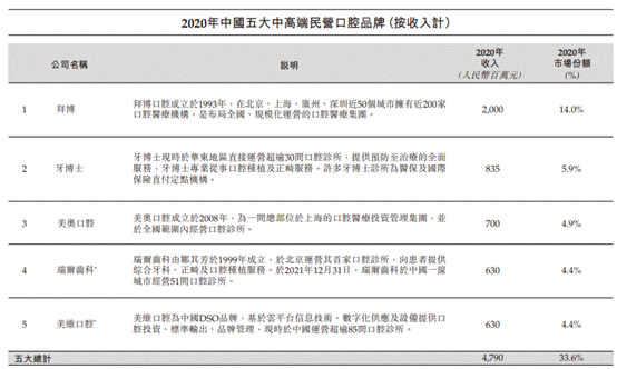 据牙博士招股书,根据灼识咨询报告,截至2020年,以收入及市场份额计,牙博士于民营口腔服务提供商中排名第五及中国中高端民营口腔服务提供商中排名第二。根据灼识咨询的资料,截至2020年,牙博士占中国民营口腔服务市场的约0.9%份额及占中国中高端民营口腔服务市场的约5.9%份额。