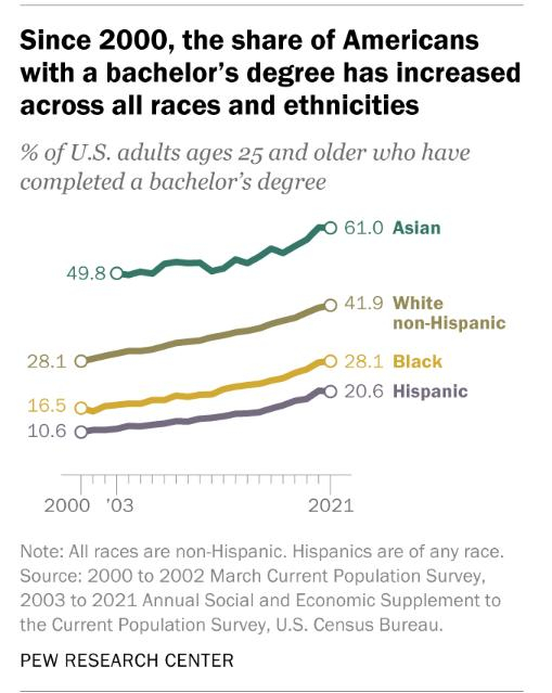 在大学毕业模式以及未完成学位的原因方面,存在着种族和民族差异。根据《2021年当前人口调查》的数据,在25岁及以上的成年人中,61%的亚裔美国人拥有学士学位或更高的学位,白人同龄人是42%,黑人是28%,西班牙裔是21%。自2010年以来,每个群体中持有学士学位的比例都在增加。在2010年,52%的亚裔美国人拥有四年或以上的学位,白人中的比例是三分之一,黑人是20%,西班牙裔是14%。
