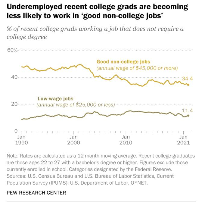 截至2021年底,在22至27岁的未充分就业毕业生中,只有34%的人从事美联储定义的“良好的非大学工作”,即那些年薪至少4.5万美元的工作,低于1990年代的约50%。22至27岁的未充分就业毕业生中,从事低工资工作,即年收入低于2.5万美元的工作的比例从1990年的约9%上升到去年的11%。