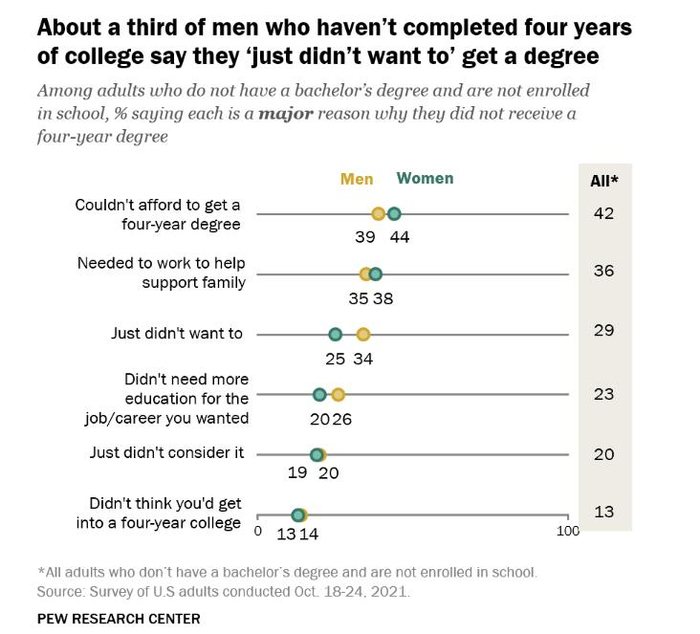 在2021年10月皮尤研究中心对没有学位的美国人进行的一项调查中,34%的男性说他们没有获得四年制大学学位的主要原因是他们不想去。持同样观点的女性只有四分之一。26%的男性说他们没有四年制学位的一个主要原因是他们不需要更多的教育来从事他们想要的工作或职业,而持同样观点的女性只有20%。