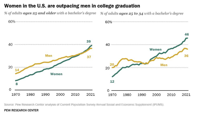 根据当前人口调查,现在女性完成大学学业的比例比男性更高,这与之前的情况正好相反。2021年,25岁及以上的女性中,有39%拥有学士或更高的学位,而同一年龄段的男性只有37%。在25至34岁的成年人中,完成大学学业的性别差距更大,在这个年龄组中,46%的女性至少有一个学士学位,而男性只有36%。