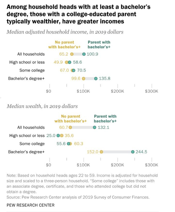根据皮尤研究中心2021年5月的分析,在收入和财富积累方面,第一代大学毕业生大大落后于父母受过大学教育的人。以第一代大学毕业生为户主的家庭,即至少完成了学士学位但父母没有大学学位的人,在2019年的年收入中位数为9.96万美元,而父母中至少有一人大学毕业的家庭的年收入中位数为13.58万美元。以第一代大学毕业生为户主的家庭财富中位数(15.2万美元)也落后于父母一方大学毕业的人为户主的家庭(24.45万美元)。二代大学生的家庭收入较高,有利于储蓄和财富积累。