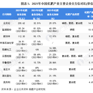 目前,云天化、盐湖股份、新洋丰等企业是国内化肥产业代表领先企业。从企业经营情况来看,2021年,云天化的化肥业务营收超过200亿元,遥遥领先于新洋丰、盐湖股份等企业;从产品布局来看,云天化拥有磷肥、氮肥、复合肥等系列产品,基于齐全的产品规格配套和卓越品质,元天化的市场竞争优势明显。