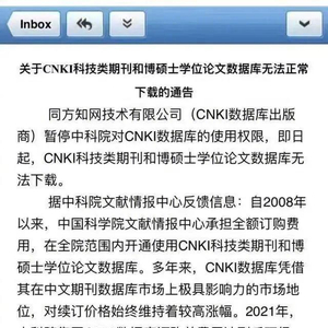 4月8日,一则落款为中国科学院“文献信息中心”的邮件显示:同方知网技术有限公司暂停中科院对CNKI数据的使用权限,即日起,CNKI科技类期刊和博硕士学位论文数据库无法下载。
