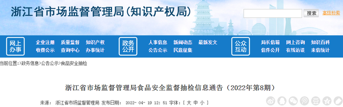 | SC22330000002730699 | 45 | / | / | 吴兴李海龙干果店 | 浙江 | 大粒肠 | / | 2022/1/21 | 肉制品 | 浙江省食品2022年第8期 | 2022.4.13 | 浙江/(省抽) | / |