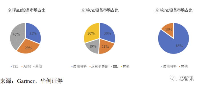 从全球市场份额来看,薄膜沉积设备行业呈现出高度垄断的竞争局面,行业基本由应用材料(AMAT)、ASMI、泛林半导体(Lam)、东京电子(TEL)等国际巨头垄断。2019 年,ALD 设备龙头东京电子(TEL)和先晶半导体(ASMI)分别占据了 31%和 29%的市场份额,剩下 40%的份额由其他厂商占据;而应用材料(AMAT)则基本垄断了 PVD 市场,占 85%的比重,处于绝对龙头地位;在 CVD 市场中,应用材料(AMAT)全球占比约为 30%,连同泛林半导体(Lam)的 21%和 TEL 的 19%,三大厂商占据了全球 70%的市场份额。