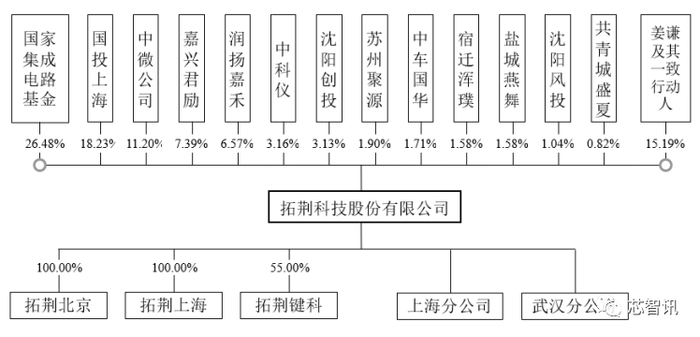 本次发行后,国家集成电路基金持有拓荆科技19.86%的股份。由于拓荆科技单个股东持有或控制的股份数量均未超过公司总股本的30%,无法形成控股,单个股东亦不能决定董事会多数席位,使得拓荆科技无控股股东及实际控制人。
