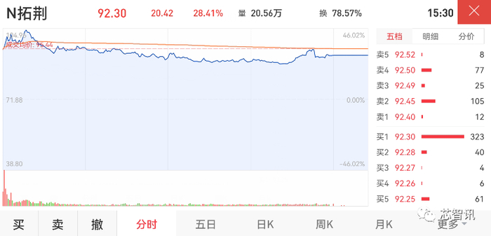拓荆科技今日开盘后,股价一度大涨46%,涨至104.96元/股,截至收盘股价回落至92.30元/股,涨幅28.41%,市值116.74亿元。