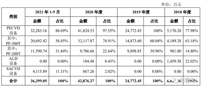 虽然在招股书当中,拓荆科技称PECVD、ALD、SACVD是其主要销售的三大类设备,但是从各类产品的产量、销量及销售收入占比来看,PECVD仍是产销量及营收占比最高的。其中,PECVD的销售收入在总营收当中的占比一直都是在77%以上。ALD、SACVD设备的产销规模较小,在营收当中的占比也较小。