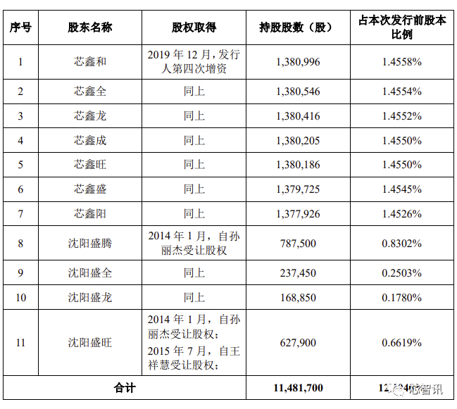 截至本上市公告书签署日,拓荆科技设有芯鑫和、芯鑫全、芯鑫龙、芯鑫成、芯鑫旺、芯鑫盛、芯鑫阳、沈阳盛腾、沈阳盛旺、沈阳盛全、沈阳盛龙等 11 个员工持股平台,合计持有发行人 11,481,700 股股份,占本次发行前股份总数的12.1040%。