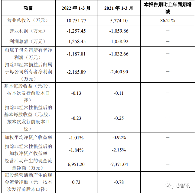 2022年1-3月,拓荆科技实现营业收入10,751.77 万元,较上年同期增长 86.21%,?净利润再度变为亏损1,187.81万元。