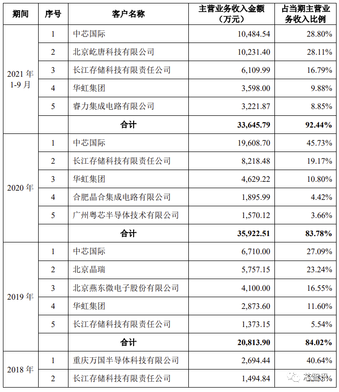 报告期内,公司各期前五大客户主营业务收入金额占当年主营业收入额的占比较高,分别为 100.00%、84.02%、83.78%和 92.44%,占比较高。这主要是由于下游集成电路行业集中度高所致。客户也主要是国内的头部晶圆厂,比如中芯国际、长江存储、华虹集团等。其中,中芯国际近两年多以来一直是拓荆科技的第一大客户。