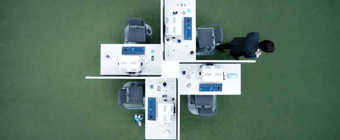 哪怕行走在其中的卢蒙员工身上,也总有一些和“卢蒙蓝”相呼应的颜色,从工牌、电脑键盘到赫丽的蓝裙与马克的蓝色创可贴……一切洗练、简约而从不失序,人也仿佛无差别地融在结构之中。
