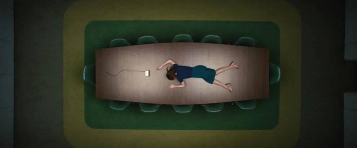 而《黑客帝国》那个以机器将人体当作电池的梗,在《人生切割术》里面以更写实的方式被表现出来,主人公自己对自己进行主动剥削,继而供养系统。outie 赫丽明知分离技术的残忍可怖,但她无视 innie 赫丽的痛苦,只要 innie 赫丽具有正当性,这种对自己身体的剥削就可以继续——两种撕裂的意识同时存在。outie 赫丽通过录像带对 innie 吼出“你不是人,我才是人”时,展现的就是一种近乎赤裸的践踏与剥削。