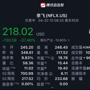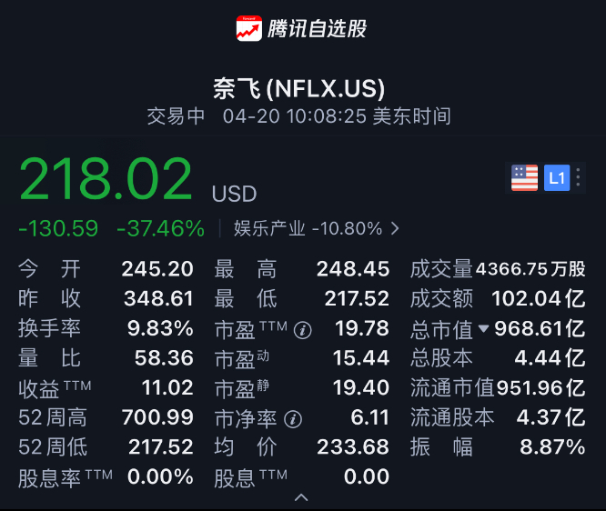 财报发布前,Netflix收盘价为348.61美元,涨3.18%,今日开盘后,Netflix股价重挫,截至发稿前,其跌幅一度超过37%,股价已跌破220美元。